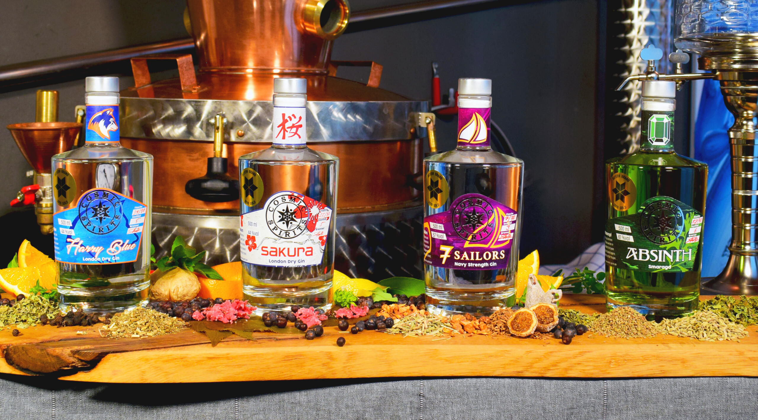 Cosmic-Spirits in München ist eine Spezialitäten-Brennerei für feinste Gins, Absinth und saisonale Destillate. Zahlreiche Goldauszeichnungen bei der Bayerischen Edelbrand Prämierung belegen die herausragende Qualität der Spirituosen. In unregelmäßigen Abständen gibt es immer wieder besondere Spirituosen im Angebot, die von feinster Qualität und nur in geringen Stückzahlen zu haben sind. Allen Produkten gemein ist das sorgsame Handwerk: Den selektierten Kräutern und Früchten werden in zwei kupfernen Potstill-Brennblasen ihre besten Aromen entlockt. Durch Verzicht auf Filtration bleiben die sensorischen Nuancen der Zutaten vollständig erhalten.